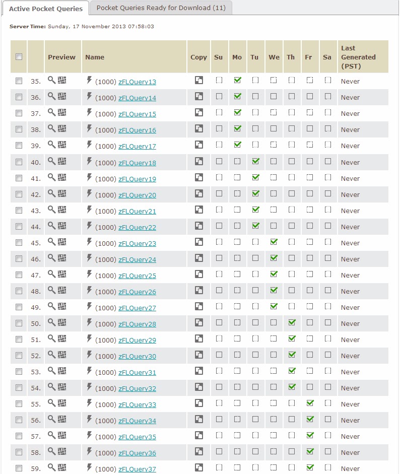 - Schedule Pocket Queries to Run One Time, 5/Day – With enough Pocket Queries created to cover all of the active caches in your state (about 20 for Georgia as of this writing), you now need to schedule them. As you can only run 5 per day, it may take a week or more of scheduled queries to run them all. When each one runs, a .ZIP file will be available for download (for up to 6 days) which can be downloaded manually or via the Download Pocket Queries option in GSAK.