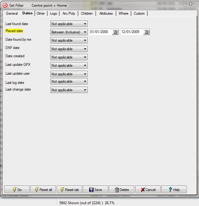 The GSAK Placed Date Filter with 6,000 Caches Shown.