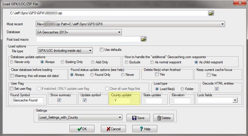 Staggered 5/day Pocket Queries. - Import Pocket Queries Into GSAK – With the Pocket Queries run, you can now import the data into GSAK. If you’ve downloaded the .ZIP files, you can load them via the File -> Load GPX/LOC/ZIP file option. If you have not downloaded them yet, you can load them via the Geocaching.com Access -> Download Pocket Queries… option. Make sure to set the County update option to Y on the load settings dialog to ensure you get county data as well.