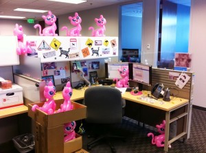 In September of 2012, Katie — our self-declared office “cat lady” went out of town for a few days.  While she was away, a few strays moved into her cube.  Big cats and little cats, pink cats and blue cats.  You name it, we had it all.  One even came with its own litter box.  Not to mention the “Crazy Cat Lady” action figure.  Enjoy!