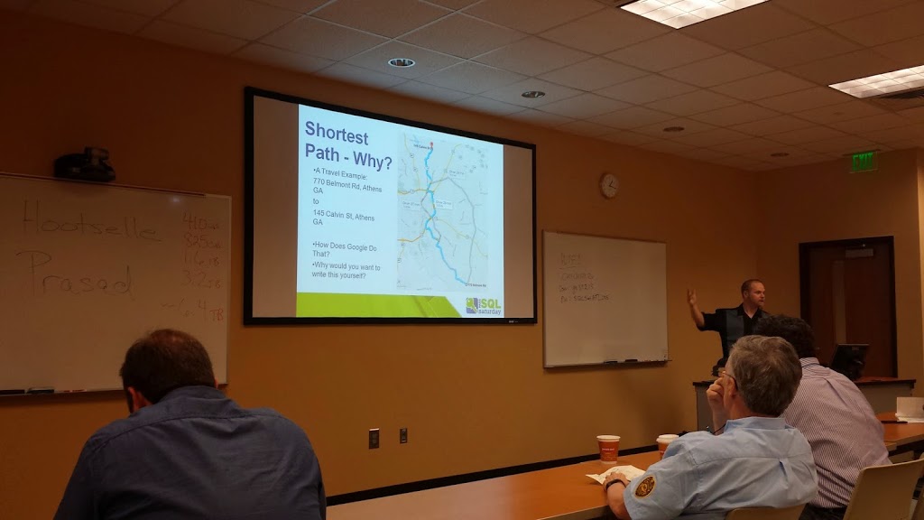 | Dan Holmes presenting GIS Data and Solving the Shortest Path at SQL Saturday Atlanta |