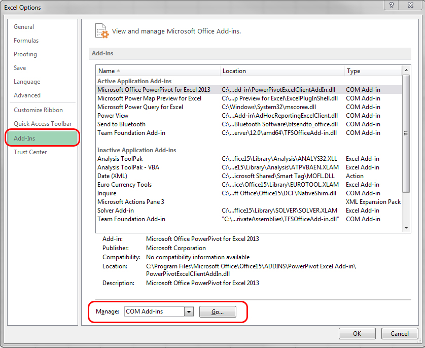 | In Excel Options, select Add-Ins and on the bottom, select Manage COM Add-ins |