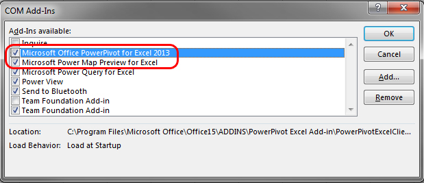 | Place checkmarks next to Microsoft Office PowerPivot and Microsoft Power Map Preview |