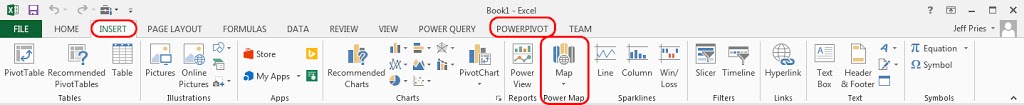 | After saving your changes, you should have POWERPIVOT on the main ribbon and under INSERT a Map option |