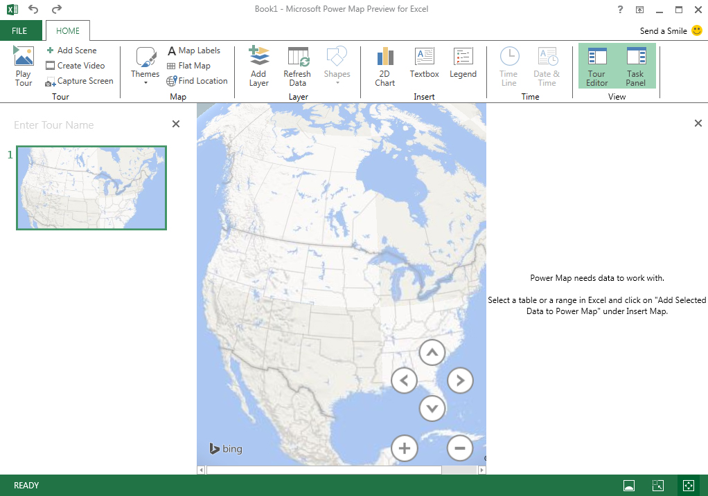 Now, if you go to the Insert tab and choose Map -> Launch Power Map you’ll see a Launch Power Map window appear. Select New Tour and we’ll finally be able to start visualizing some data!