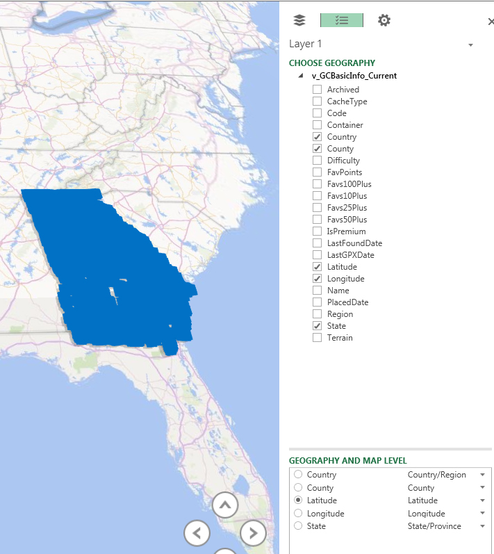 With that, I’ll conclude my visualizations of Geocaching data using Power Map. Power Map is capable of much more, including other chart types such as columns and bubbles as well as time lapse, 3-d, and creation of flyover movies. It does have some weaknesses as far as granularity of control of charting elements as well as the inability to use custom GIS shapefiles. Over time, I hope that it becomes an increasingly powerful tool
