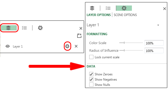 We’re getting better, but it’s still a bit muddy. Select the leftmost option, which looks like a stack of papers and then select the gear icon next to Layer 1. This will allow us to adjust the settings for how the heatmap performs its groupings. By redusing the Radius of Influence and potentially the Color Scale we can break the big blob of red up into more diverse colorings.
