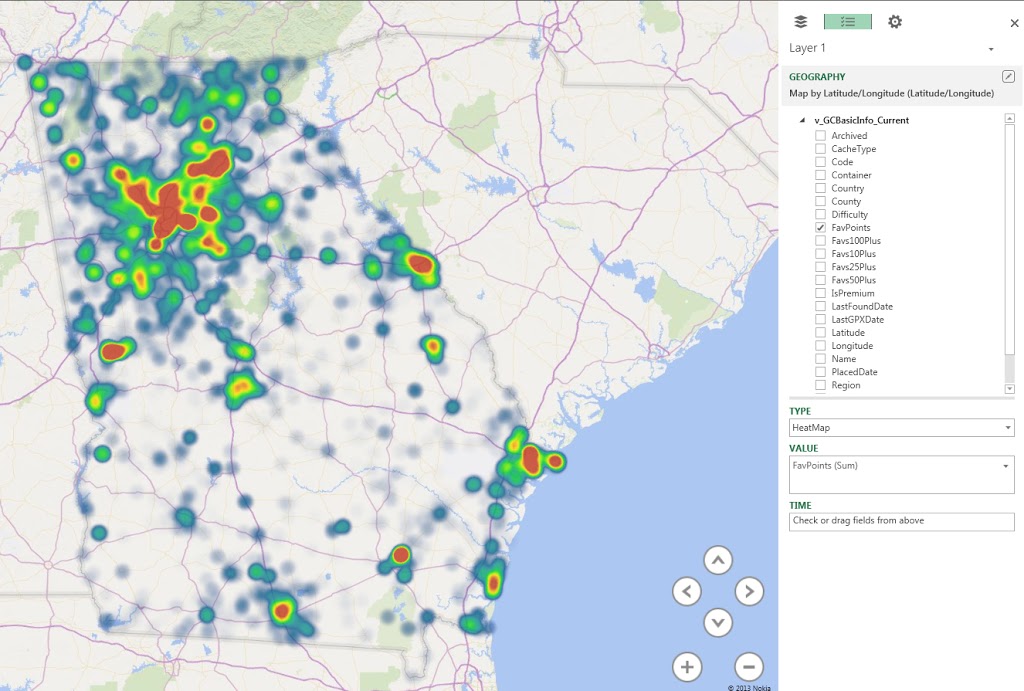 For one final visualization with Power Map, we’re going to add another dimension to our map. Every Geocache has a number of favorite points associated with it. These are awarded by people to caches they like. Over time, the “best” caches tend to accumulate the most favorite points. Seems a great opportunity for a heatmap!