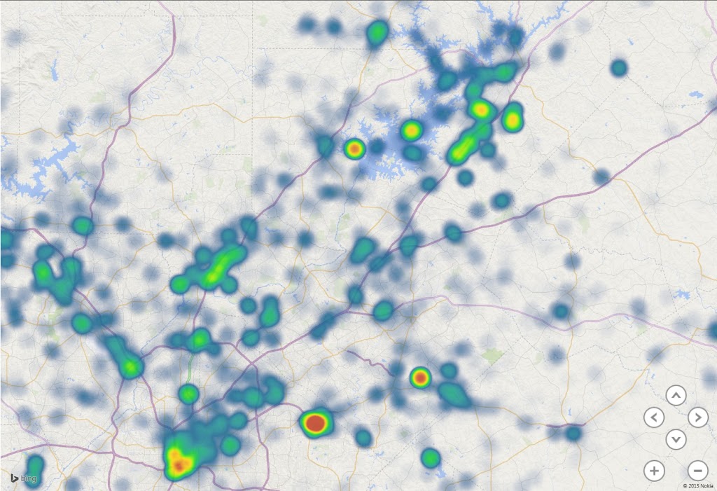 | Geocache favorite point distribution heatmap for northern Georgia |