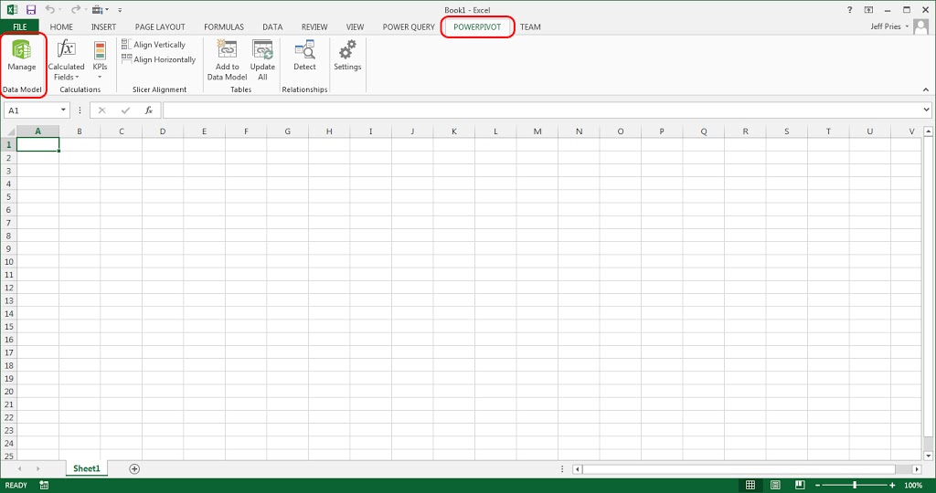 Start by selecting the POWERPIVOT tab and then press the Manage button which will launch PowerPivot. This will launch a fairly empty PowerPivot window with a new ribbon on top.