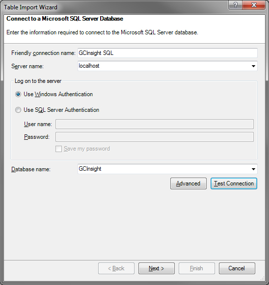 Within the wizard, choose a friendly name, the name of your SQL server, the authentication method, and the database name. Once complete, press the Test Connection button and hopefully it’ll succeed.