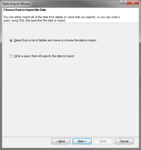 From our PowerPivot window, select From Database on the top ribbon and From SQL Server beneath that. This will launch the Table Import Wizard.