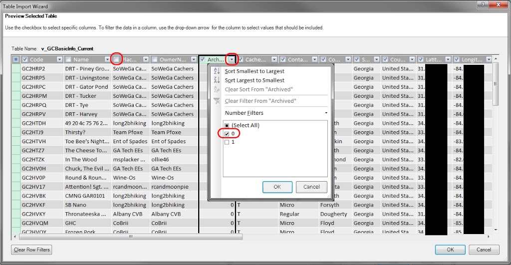 By selecting the Preview and Filter button on the table selection pane, we can choose exactly which columns are brought over. For performance reasons, it’s generally a good practice to not bring over anything you definitely don’t need, but our dataset is small enough that it doesn’t matter too much. Additionally, you may want to include filters. Since we’re only concerned about active Geocaches, we’re going to add a filter to the Archive column so we only get values of 0 (not archived).