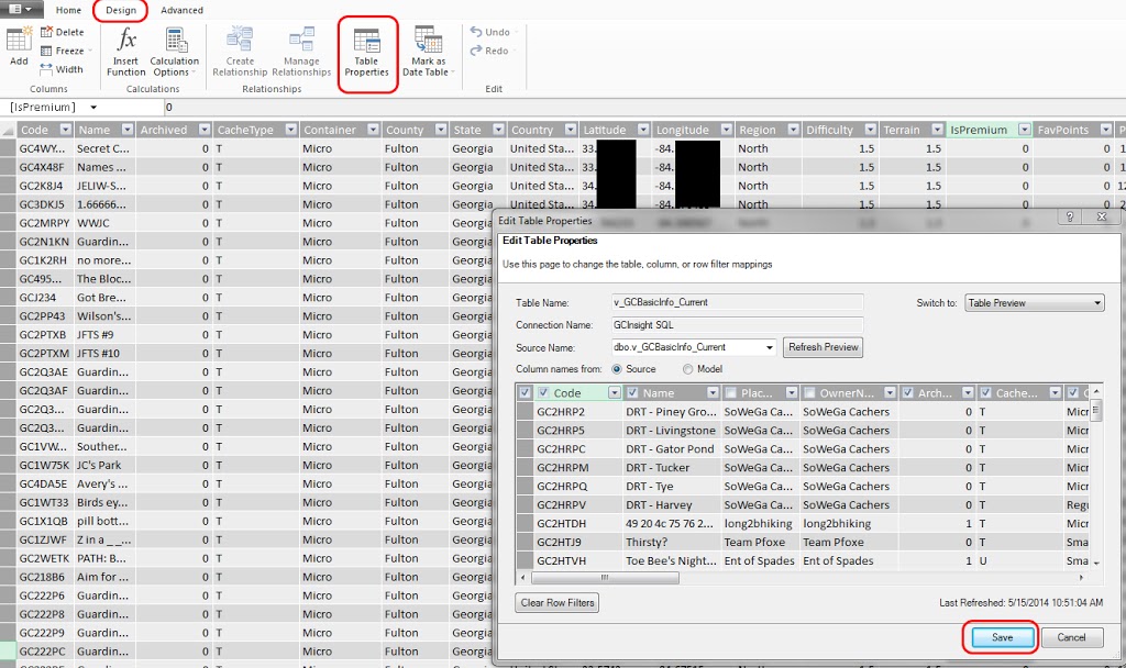 You’ll now see all of your data laid out in a big table. You can perform further filtering on it here if you like, but note that you cannot actually change the raw data. Should you decide that you should’ve brought over additional columns from SQL or there were columns you really didn’t want, you can modify your selection by going to the Design tab and selecting Table Properties.