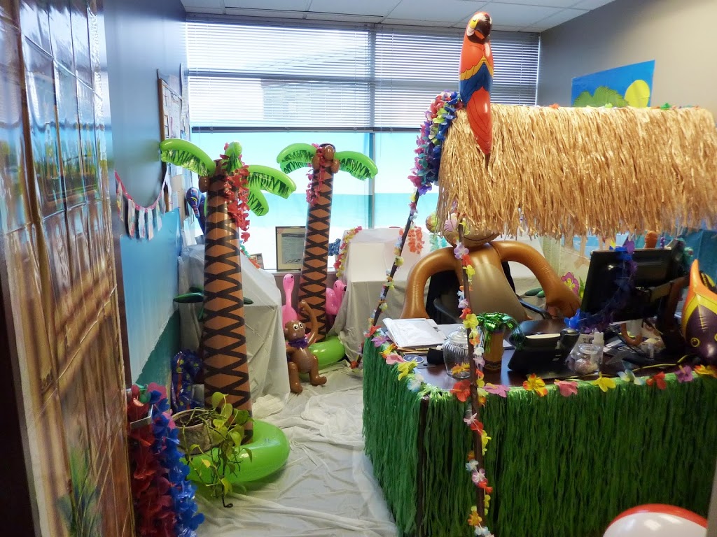 In July of 2013, Wendy went on a weeklong cruise.  You know what happens when you leave your office unguarded for a week — hijinks ensue!  In this case, I decided to bring the beach to Wendy’s office, complete with a beachy backdrop, palm trees, a full Tiki Bar, and local wildlife.  All we were missing were the margaritas…next time!  Enjoy!