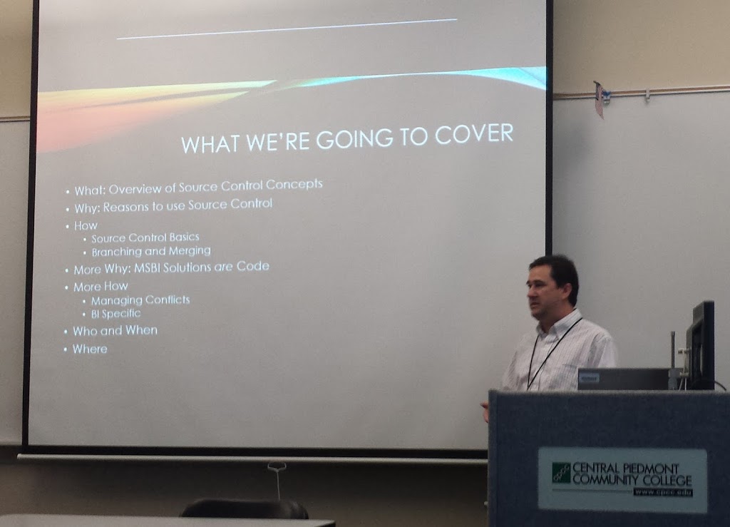 After enjoying lunch, I attended Bryant Byrd’s (B | T) “Source Control with MSBI Solutions.” Bryant makes an excellent point that even though most BI projects are made up of source code, source control, such as TFS, is rarely used. I agree completely, something I need more work with!