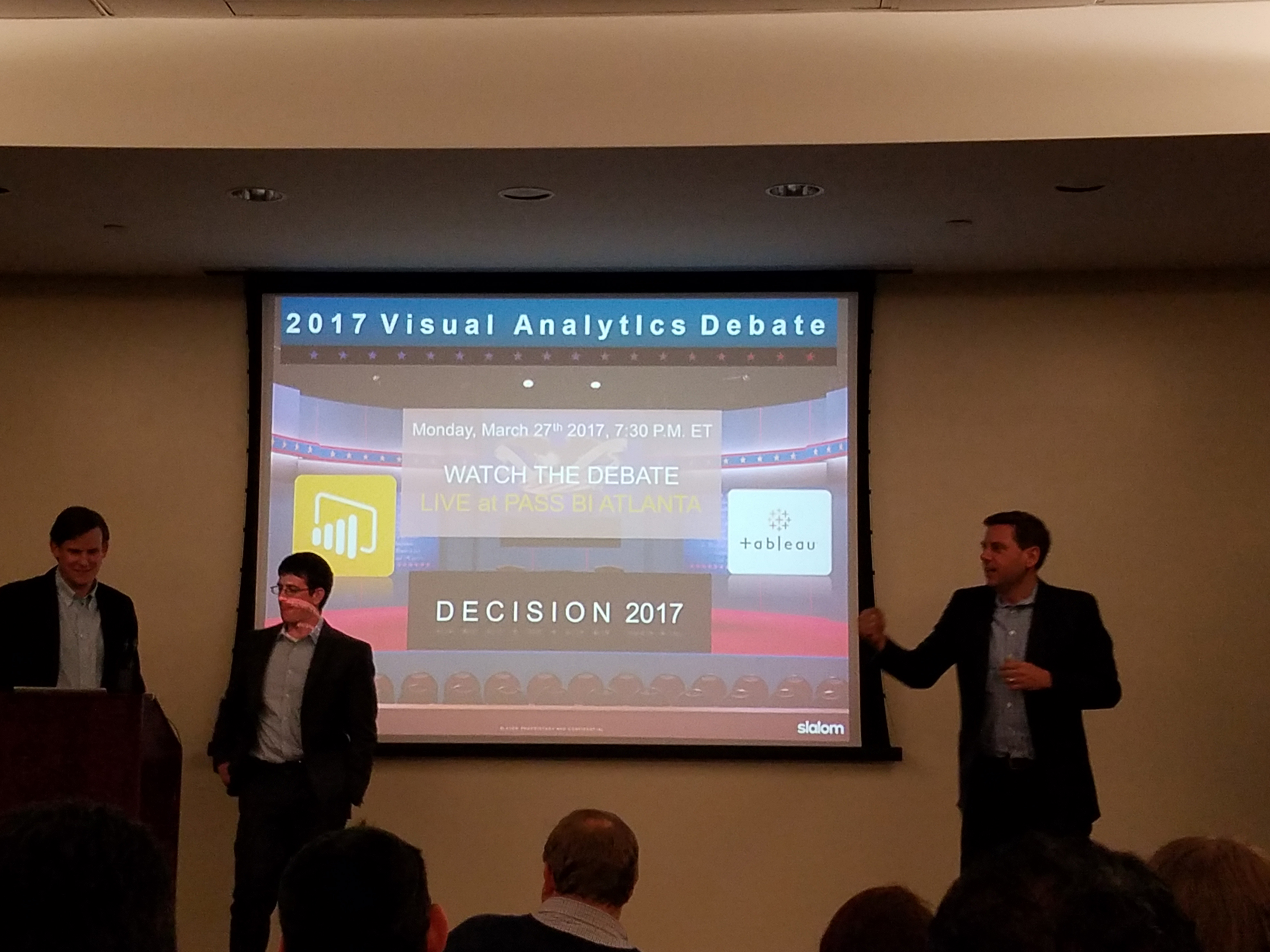 In March, a couple of the guys from Slalom, Dave Tangren and Nelson Davis, gave a talk on the benefits of Power BI vs. Tableau at the Atlanta BI meeting.  This is interesting in of itself since these two products are direct competitors which are in an active battle, but what made this presentation really fun was that they modeled it as a political debate, with each product being a candidate.  They had a moderator who would ask questions and then each candidate would give his answer.  A really creative way to present this information!