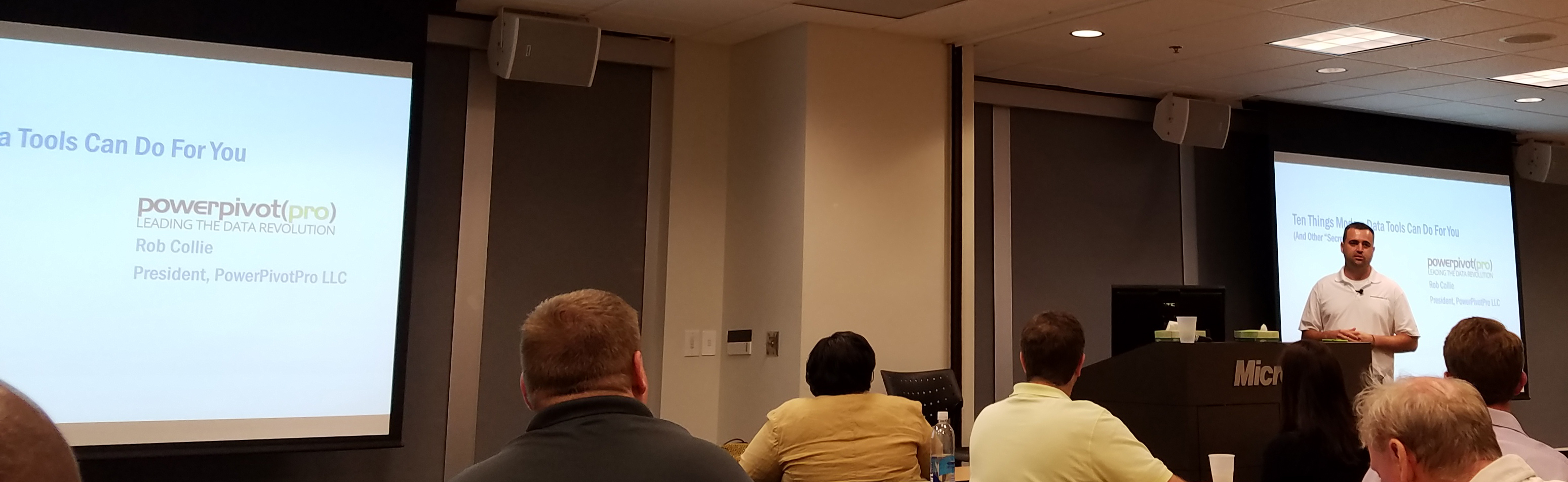 In August,  Rob Collie presented “Ten Things Power BI Can Do For You” at the Atlanta MDF August Meeting.  In this talk, Rob gave a history of Power Pivot (Project Gemini) from his time at Microsoft as well as his experiences in transitioning to a consulting organization specializing in Power Pivot.  The entire presentation was non-technical and talked about the benefits of using Power Pivot (and DAX) with or without Power BI.  A very interesting topic and Rob was a very good speaker, not afraid to call things as they are.  I got a bit of an Office Space vibe from the style (in a good way!)  I highly recommend you check out one of Rob’s presentations if he ever presents again in the area!