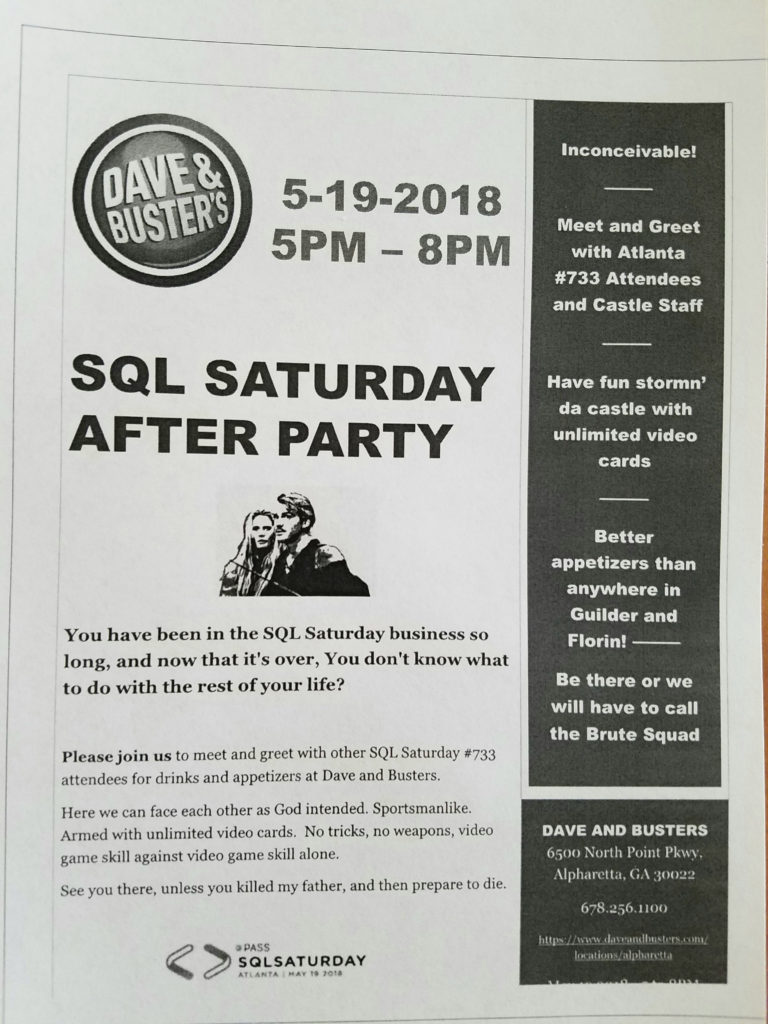 This past Saturday, May 19th marked the 733rd SQL Saturday Event — SQL Saturday #733 – Atlanta. Being my home event, and consistently a large and well-executed event, I look forward to this one every year and also volunteer to help out with room proctoring and any other help that is needed. Since the loss of the GSU Alpharetta Campus as a venue, the event has bounced around looking for a new home. This year, it was hosted at the Alpharetta Campus of Gwinnett Technical College, which I felt was an excellent venue (though not quite as convenient to me as last year’s Duluth Campus).