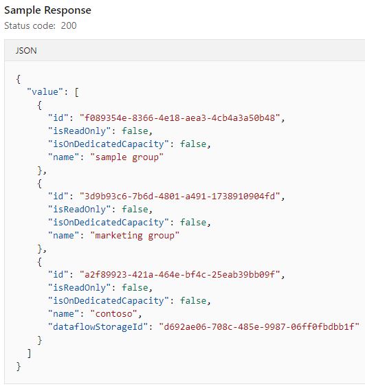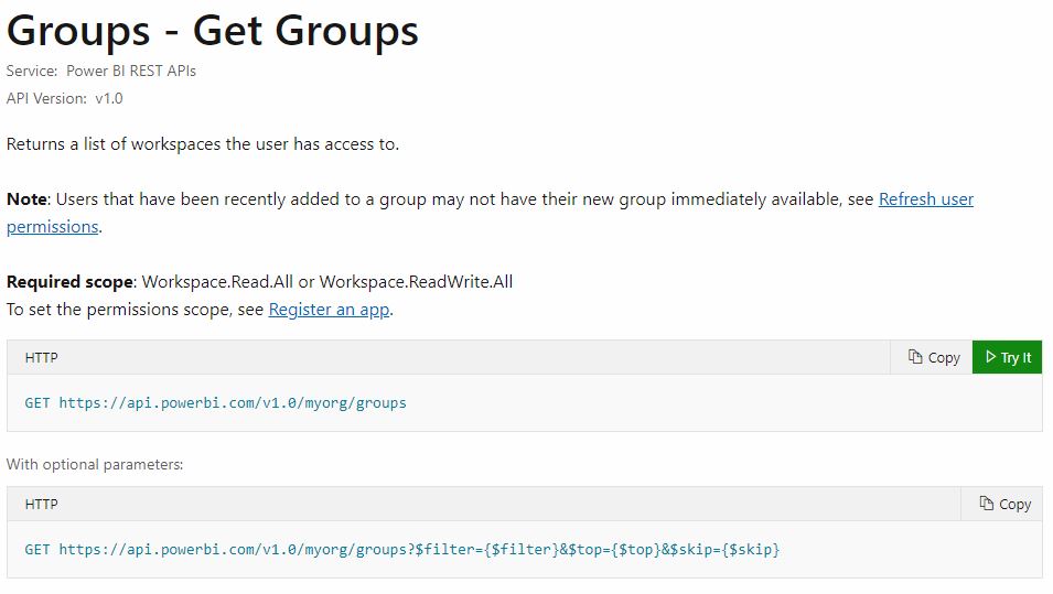 To get information about Workspaces, for instance, that can be found in the “Groups” group of the reference (this is the only one that isn’t named intuitively — reflecting a name change of the functions along the way.) The “Get Groups” function will return information for Workspaces in the Power BI Service for which you have access.
