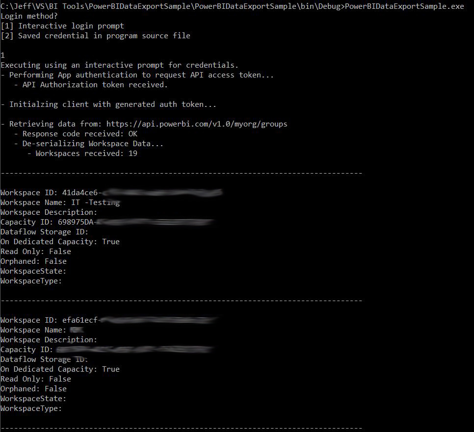 When run, the application prompts for whether you’d like to perform an interactive authentication (recommended) or use the values which were stored in the source file when compiled. Once authentication credentials have been entered (which are sent directly to Azure Active Directory) the program sends the “Get Workspaces” command to the Power BI REST API, receives the result JSON file, de-serializes it into individual pieces of data, and outputs the data to the screen.