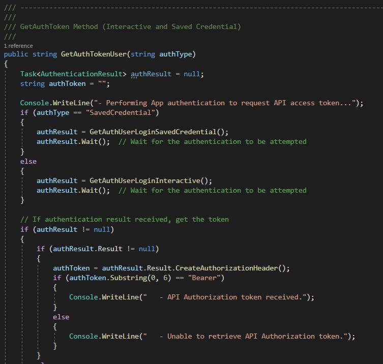 Sample code snippet to call either the Interactive or Saved Credential method, wait for the response, and then request the “bearer token” which is then used in subsequent API requests.