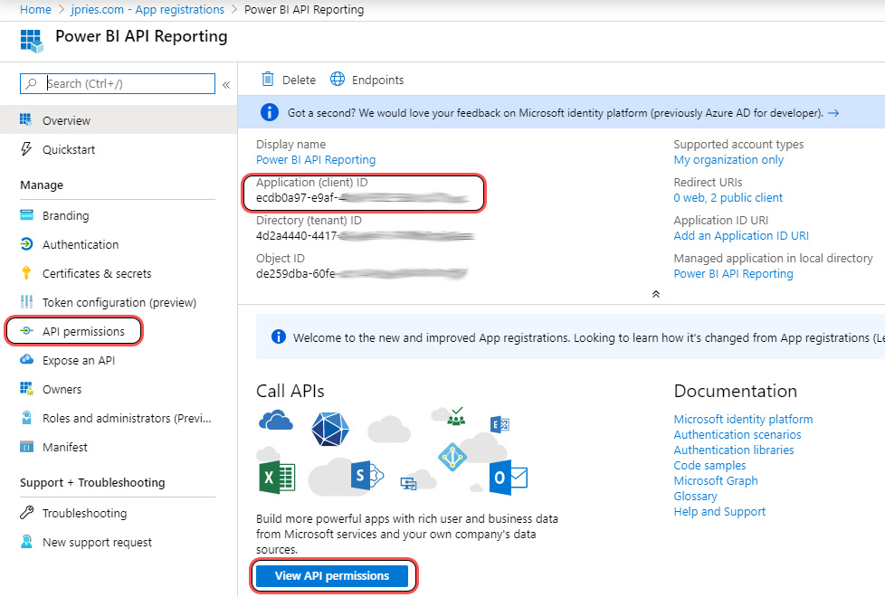 Within your registration, click on View API permissions either on the left menu or bottom button. Also note that your Application Client ID used in your application is visible at the top of the page.