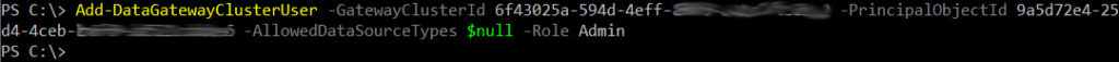 Add-DataGatewayClusterUser -GatewayClusterId -PrincipalObjectId -AllowedDataSourceTypes $null -Role Admin