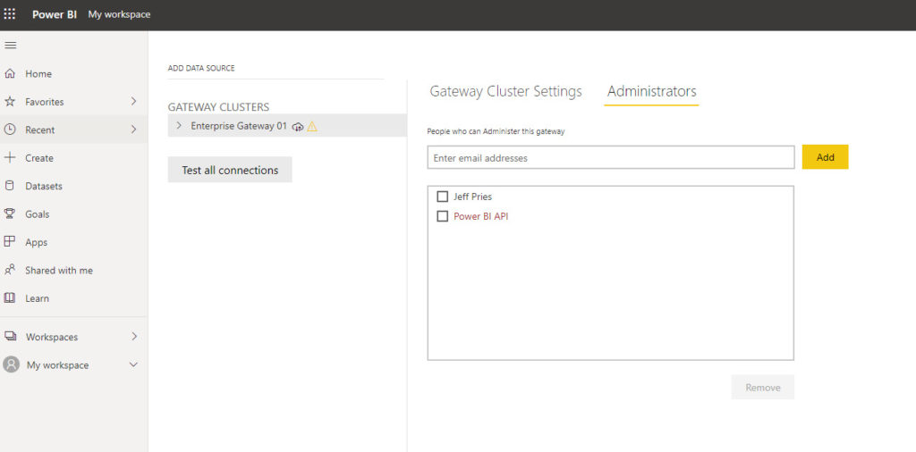 5. Go back to the Manage Gateways section in the PowerBI.com UI and check the Administrators. If everything worked, you should see the entry you added in a dark red font in the list of Administrators.