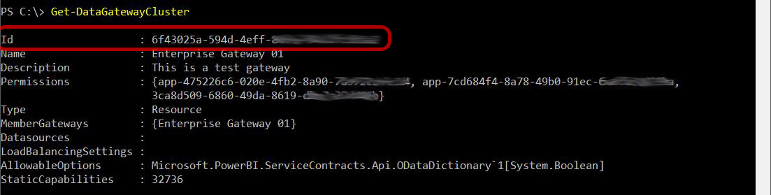 2. Run the Get-DataGatewayCluster command and make a note of the unique identifier on the Id row for the Gateway Cluster name which you wish to add a user/object to.