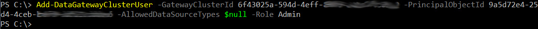 Add-DataGatewayClusterUser -GatewayClusterId -PrincipalObjectId -AllowedDataSourceTypes $null -Role Admin