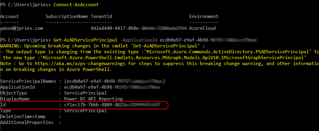 To get an SPN, you’ll need the application ID (which we got from the group member command above as our Application was a member of a group):