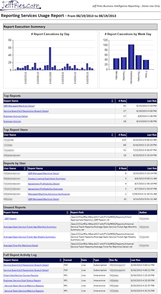 How can we tell which reports are used and how frequently? SSRS to the rescue! Both Native Mode and SharePoint Integrated mode support a method of querying reporting services to find the usage history of all executed reports. I performed these queries and created this sample SSRS report to visualize the usage over time.